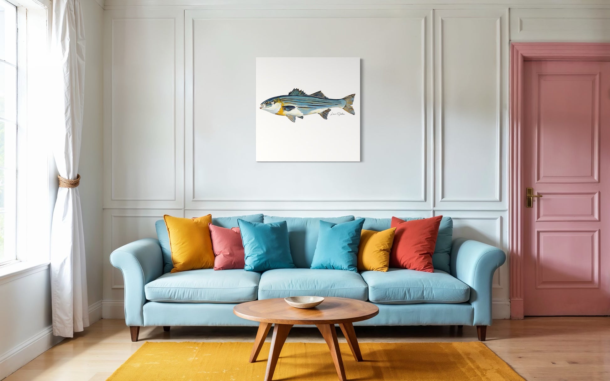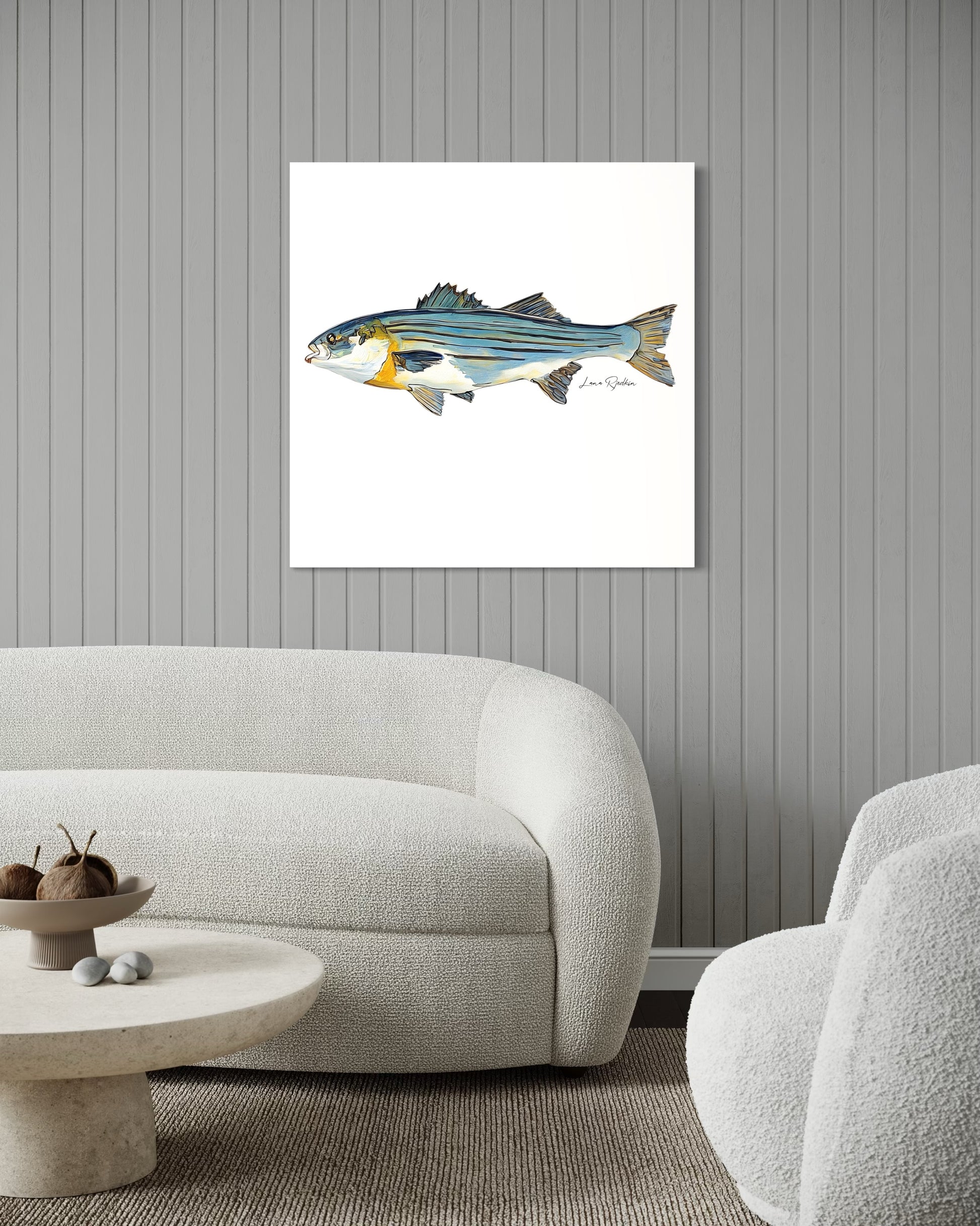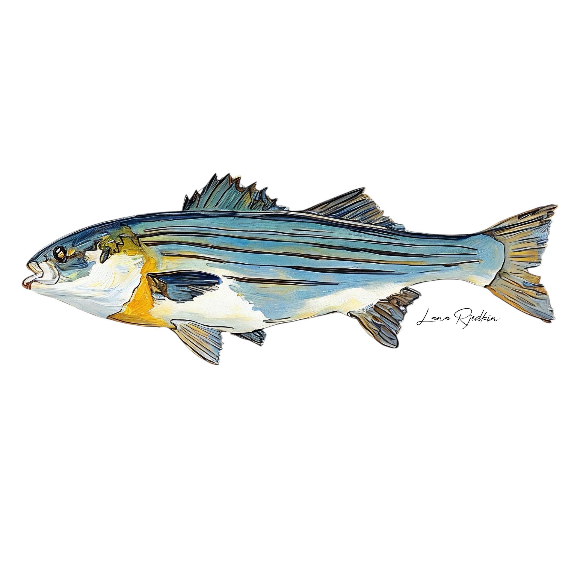This stunning striped bass print captures the essence of aquatic beauty, featuring vibrant colors and intricate details that showcase the majestic fish in its natural habitat. Ideal for adding a touch of coastal charm, this artwork seamlessly complements any kitchen, office, or residential space. Embrace the allure of marine life with this striking visual that brings the serenity of the sea into your home or office.